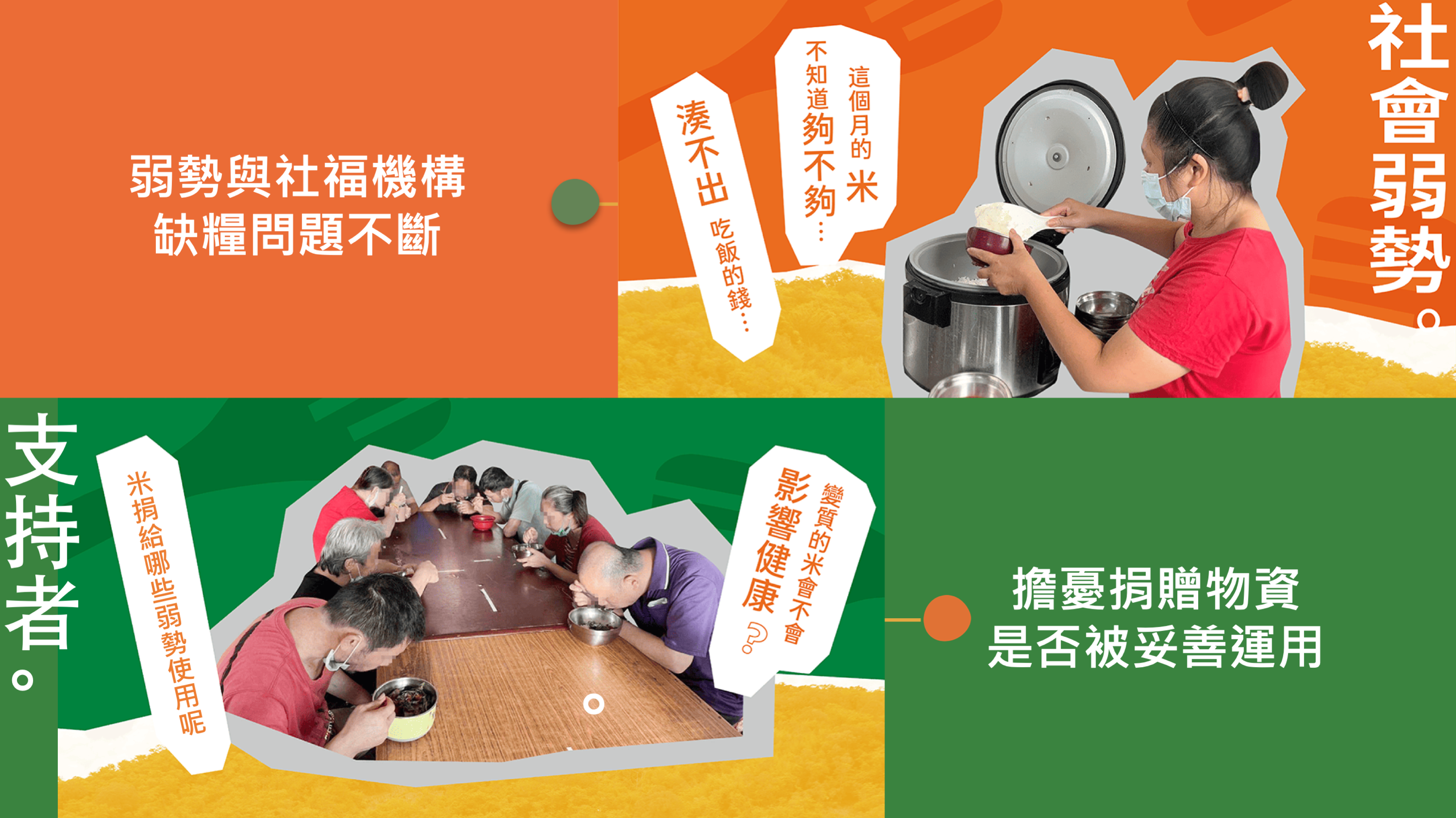 在台灣,許多弱勢者每天溫飽的唯一依靠是微型/地方性社福機構。然而,因為社會大眾捐贈的物資很不穩定,米糧不足的機構經常要向外求援,或者在收到即期米或一次性大量捐贈後,要處理米糧難保存、不方便分送、過期長米蟲等狀況。而對於選擇不多的弱勢者來說,長期食用這些品質不佳的米糧是健康上的隱憂,很有可能導致生活上更沈重的負擔。