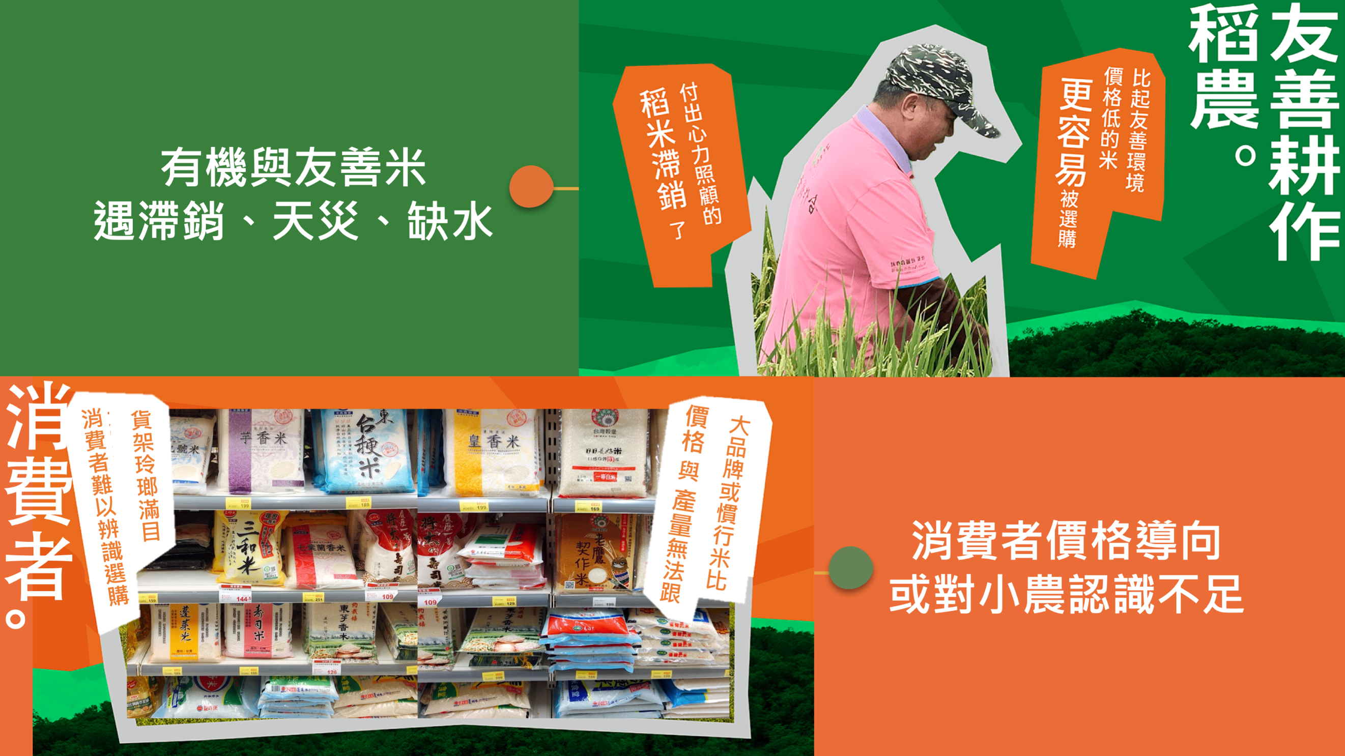 台灣有3%左右的農夫使用有機與友善耕作的農法種植水稻,希望能讓環境跟人都可以變得更好。然而,有機與友善耕作的成本較高、產量有限、銷售推廣不易、國人食米量年年創新低與氣候異常等因素,滯銷問題頻繁發生造成稻農的收入不穩定,這導致農友們開始思考,還要不要繼續堅持有機與友善耕作,或是選擇放棄從農。