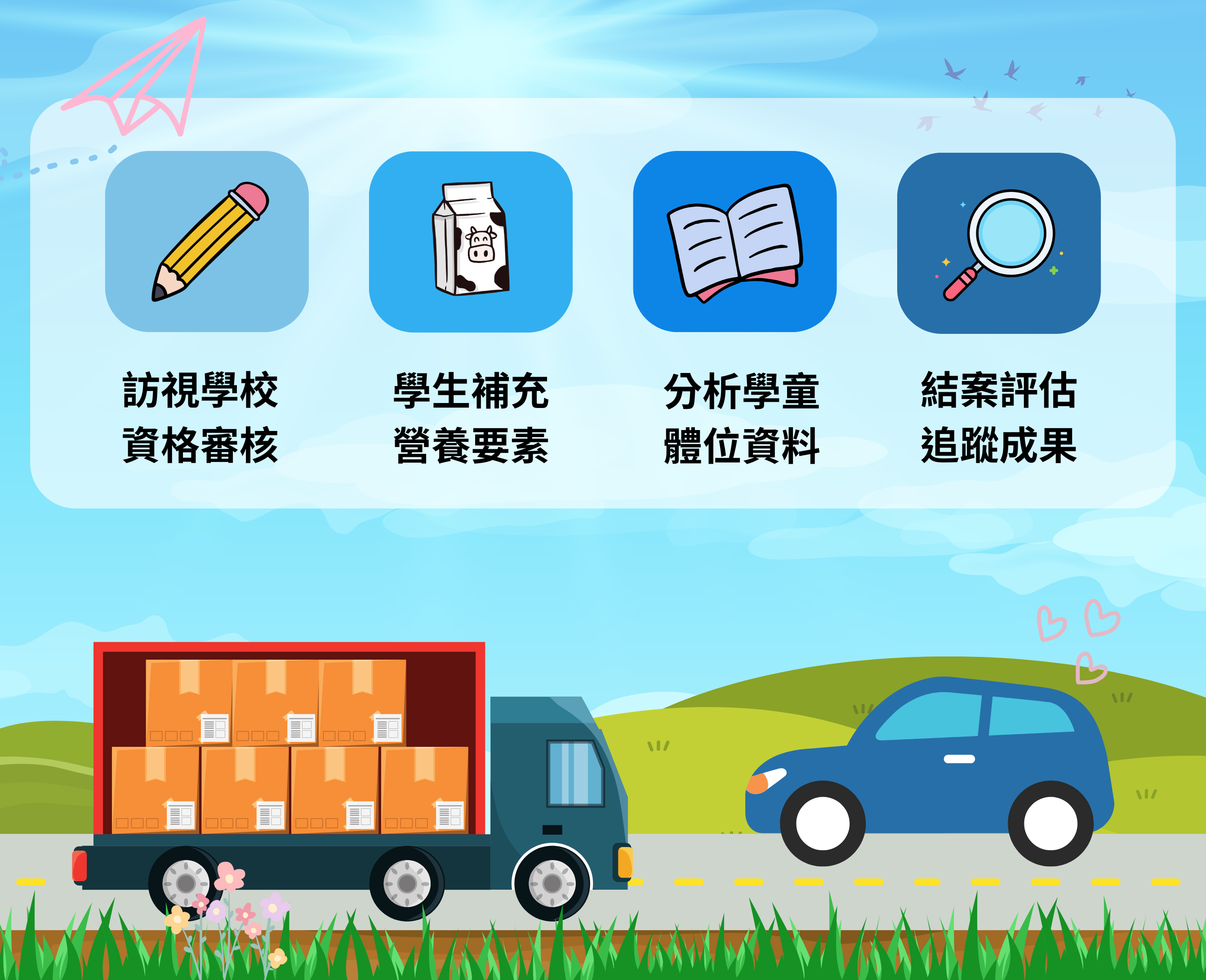 • 每月配送營養物資至合作學校,由老師協助發放與宣導。