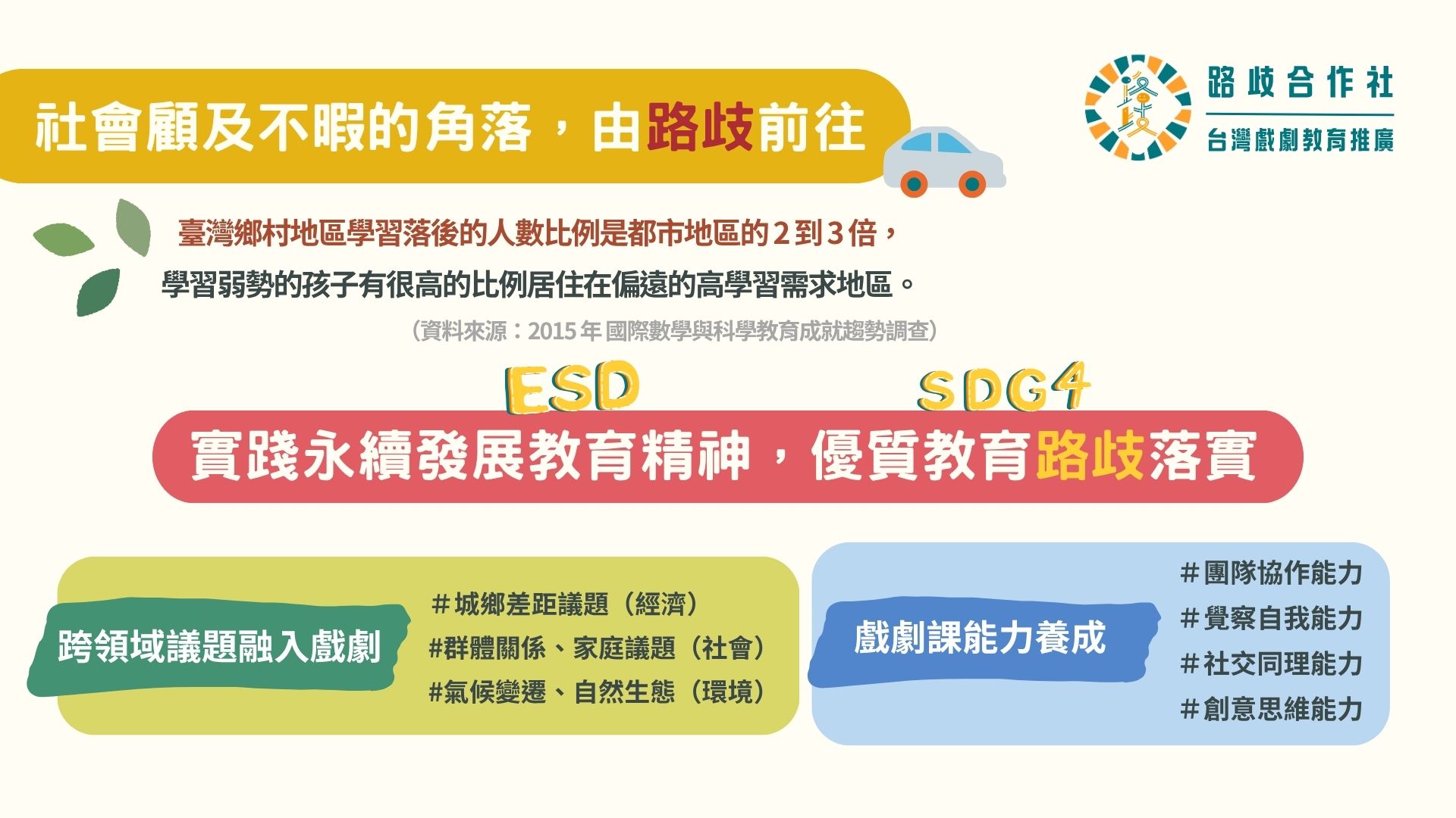 路歧合作社的創辦人林芳羽與王珮蓉深信,藝術教育應該從根本紮根,並實踐教育機會均等的理念。回顧成長歷程,她們發現自己在孩提時期接觸劇場的機會極為稀少。直到大學來到臺北,才驚覺城鄉之間在文化與藝術資源上的巨大落差——在這座五光十色的城市裡,幾乎每週都有演出與藝文活動正在發生,這樣的景象讓她們感到既震撼也遺憾:為什麼童年時沒有更多接觸藝術的機會?