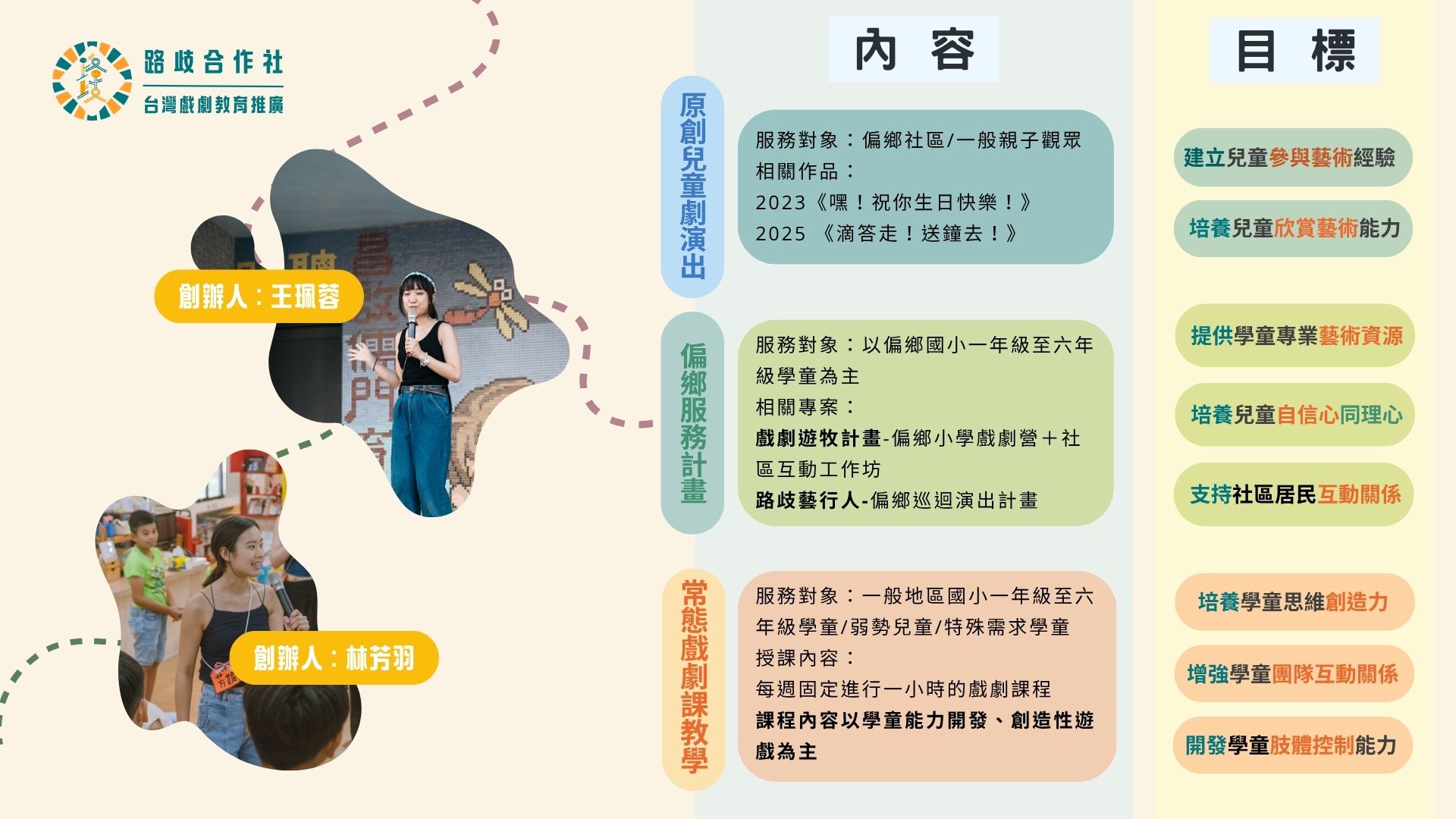 正因為來自非都市地區,兩位創辦人從小便深刻體會到藝術資源分布的高度不均。這份體會,成為她們創立路歧合作社的重要起點。她們希望將自身的劇場專業轉化為教育行動,將藝術的種子帶進臺灣偏鄉的小學課堂。