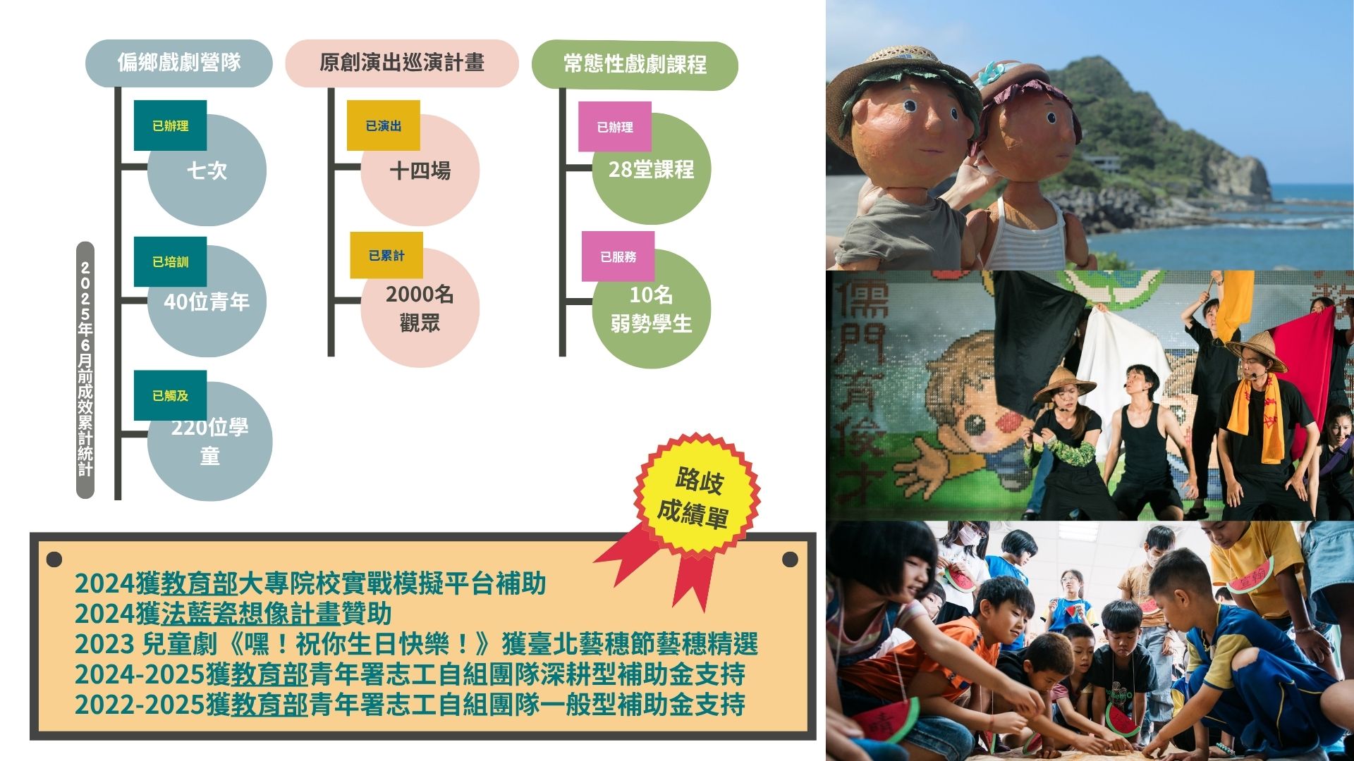 在偏鄉戲劇營隊方面,我們設計為期五天、總時數達30小時的密集課程,融合戲劇遊戲與表達訓練,讓孩子們在引導中累積自信與創造力。自2020年起已辦理 7梯次營隊,服務遍及花蓮、臺東、彰化等地,累積服務人數達220位學童。原創演出巡演計畫則以兒童劇《嘿!祝你生日快樂!》為主,透過偶戲與觀眾互動,講述城鄉資源差距的故事,深入校園、社區與藝術節演出現場。截至目前已完成14場巡演,觸及觀眾超過2000人,並曾獲教育部計畫支持、獲選臺北兒童藝術節節目、臺北藝穗節與青藝盟《風箏計畫》等多項活動邀演肯定,2023 原創兒童劇《嘿!祝你生日快樂!》更榮獲臺北藝穗節藝穗精選獎的成績。常態性戲劇課程則以12至15堂為一學期,針對國小學生與特殊教育需求學童進行感官、認知與情緒發展引導。目前已於友善兒少據點進行28堂課程教學,累積服務10位學生,作為深耕式長期陪伴的實驗與實踐。