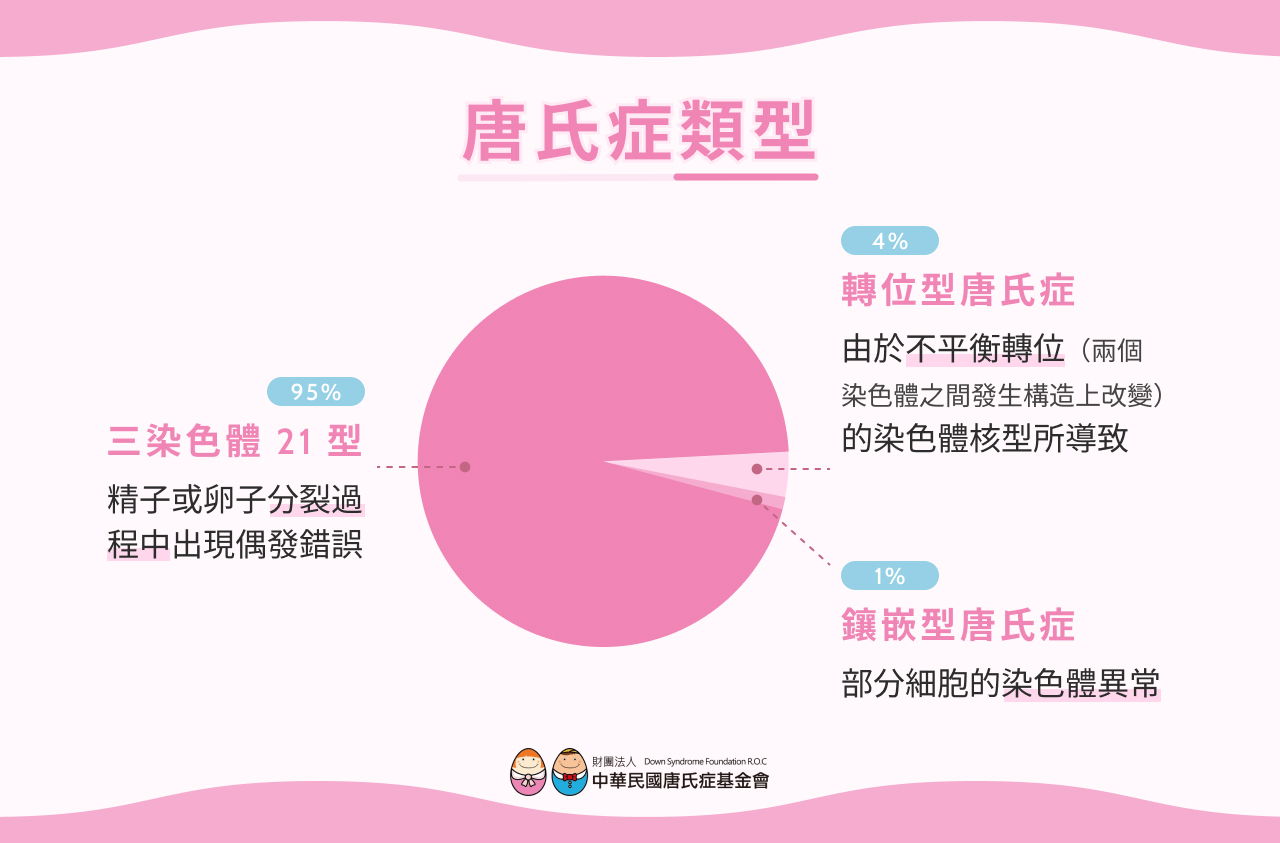 · 轉位型唐氏症(約4%):染色體數量與正常人相同,不過由於不平衡轉位(兩個染色體之間發生構造上改變)的染色體核型所導致,部分情況可能來自父母的遺傳。