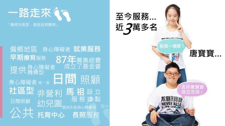 一步一腳印,唐氏症基金會成立迄今,逐年將服務經驗拓展到其他有需求的地方,期許能夠成為串聯資源的公益平台,透過整合政府資源、專業服務、社會大眾力量,成為唐氏症者、身心障礙者及其家庭不倒的力量。