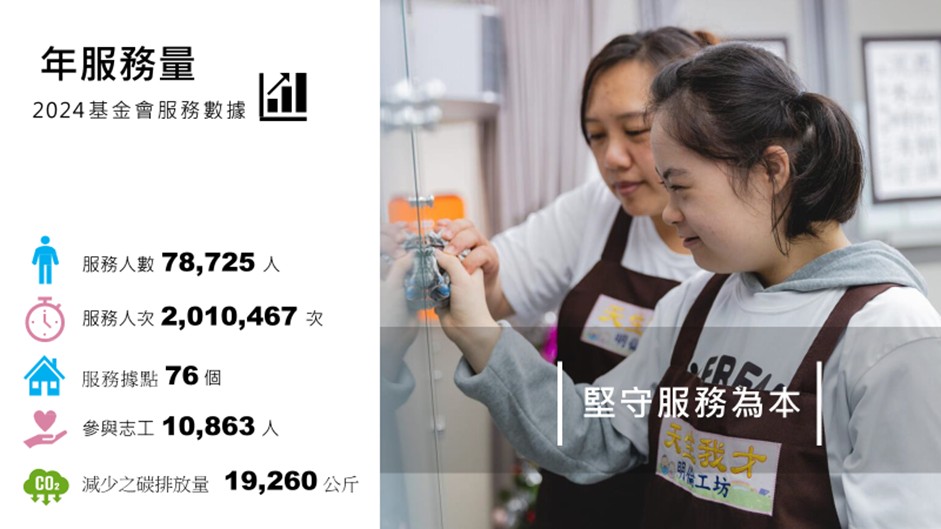 唐氏症基金會秉持「堅守服務為本」的精神,持續擴展全生涯照顧服務,2024年全台服務人數達7萬8,725人,總服務人次突破200萬。透過76個服務據點,我們提供從早期療育、幼兒教育、日間照顧、自立生活訓練到就業支持的多元服務,並在物資配送與家庭支持上持續投入,實際回應唐寶寶及身障者及照顧者的各種需求。更有1萬863位志工熱情參與,攜手推動並完善整體照顧服務。同時,基金會積極實踐環保理念,減少碳排放量達1萬9,260公斤,以行動落實永續關懷,讓愛與陪伴持續走進每一個有需求的唐寶寶及身心障礙者的家庭。