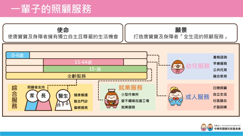 我們始終相信,每一個孩子都是獨特的,只要給他們機會,他們可以擁有自己人生的舞台。因此,唐氏症基金會以身心障礙服務為起點,我們依據每一個身障孩子的需要和能力提供個別化的服務,因應不同生涯階段的需求,提供不同的服務內容;我們也從小紮根,致力於發展公共托育服務,希望成為每一個孩子人生第一個接觸的社福組織,每一個年輕家庭第一個認識的社福機構,透過社會教育,讓更多的人認識身心障礙者,接納身心障礙者,進而促進整體社會的共融。