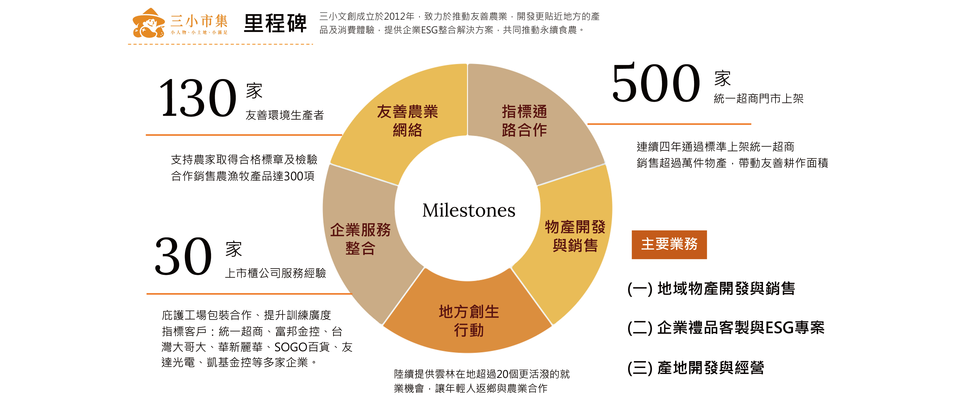 三小文創成立於2012年,致力於推動友善農業與永續食農,開發貼近地方的產品與消費體驗,並提供企業 ESG 整合解決方案。我們經常走入產地、拜訪農民、參與地方活動與市集規劃,實踐從土地出發的行動價值,並已逐步達成以里程碑: